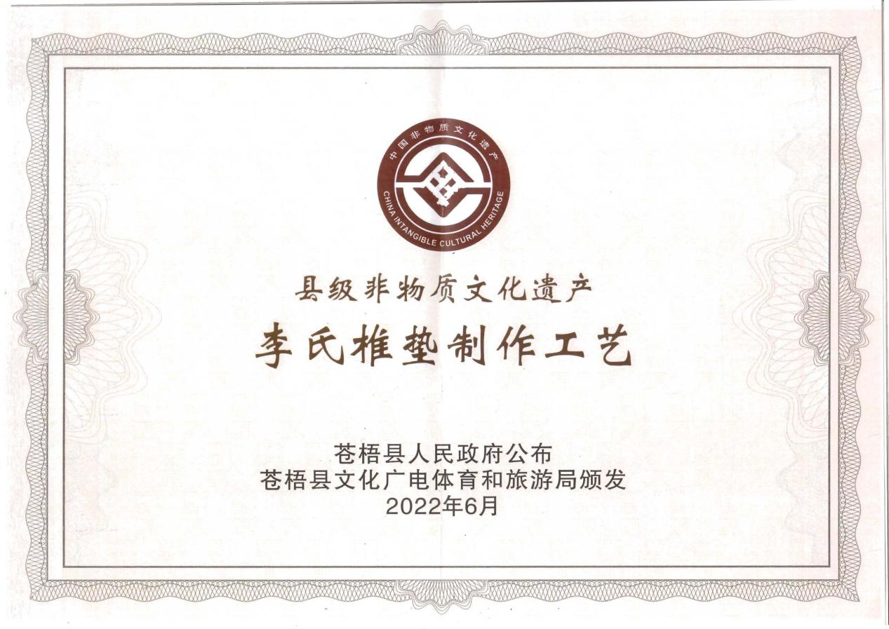 李氏椎墊制作工藝,于2022年6月被列入縣級(jí)非物質(zhì)文化遺產(chǎn),證書由蒼梧縣人民政府公布,蒼梧縣文化廣電體育和旅游局頒發(fā)。