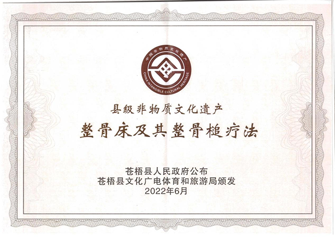 熱烈祝賀廣西強(qiáng)壽藥業(yè)集團(tuán)有限公司整骨床及其整骨槌療法喜獲縣級(jí)非物質(zhì)文化遺產(chǎn)項(xiàng)目。證書(shū)由蒼梧縣人民政府公布,蒼梧縣文化廣電體育和旅游局頒發(fā)。